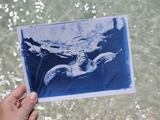 Pour les réaliser, une solution photosensible est d’abord un papier, exposée dans un second temps au soleil avec un négatif, puis rincée à l’eau pour révéler une image unique.